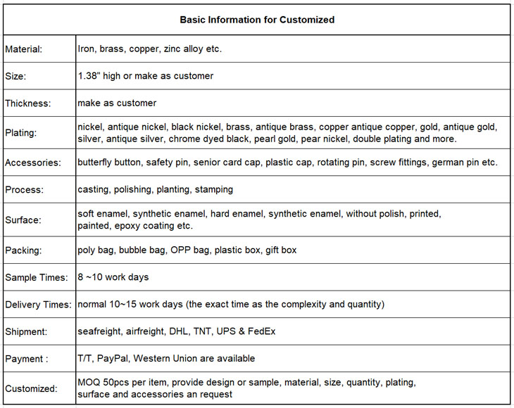 4. Customer make the payment for deposit and send us Bank receipt.5. Initial Production Stage-Inform the clients that we have got the payment, And will make the Custom School Pins samples according to your request, send you photos or Samples to get your approval. After approval, we inform that we will arrange the production & inform the estimated time.6. Middle Production-send Custom School Pins photos to show the production line which you can see your products in. Confirm the estimated delivery time again.7. End Production-Mass production products photos and Custom School Pins samples will send to you for approval. You can also arrange the third party Inspection.