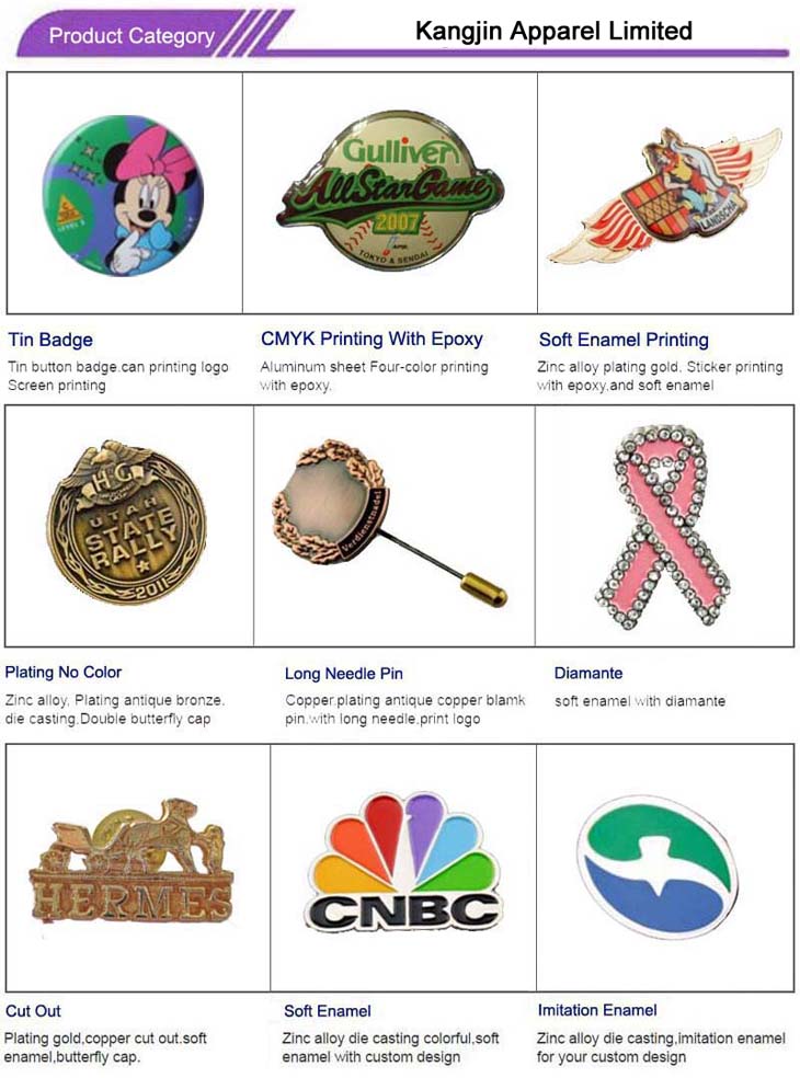 chrome dyed black, pearl gold, pear nickel, double plating and more.Accessories: butterfly button, safety pin, senior card cap, plastic cap, rotating pin, screw fittings, german pin etc. Process: casting, polishing, planting, stamping Surface: soft enamel, synthetic enamel, hard enamel, synthetic enamel, without polish, printed, painted, epoxy coating etc. Packing: poly bag, bubble bag, OPP bag, plastic box, gift box Sample Times: 8 ~12 work days Delivery Times: 10~15 work days (the exact time as the complexity and quantity) Shipment: seafreight, airfreight, DHL, TNT, UPS & FedEx Payment: T/T, PayPal, Western Union are available Customized: MOQ 50pcs per item, provide design or sample, material, size, quantity, plating, surface and accessories an request