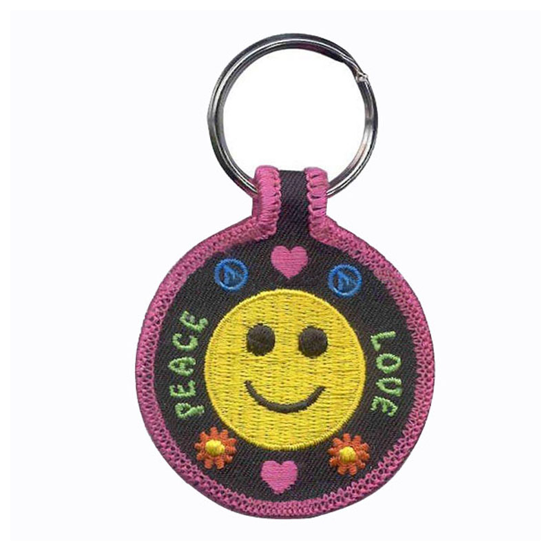 This Smiley Face Embroidered Keychain is centered on a yellow smiley face with the words "PEACE LOVE" and elements such as hearts and small flowers, It is colorful and cute #embroiderykeychain #smilekeyring #keychain